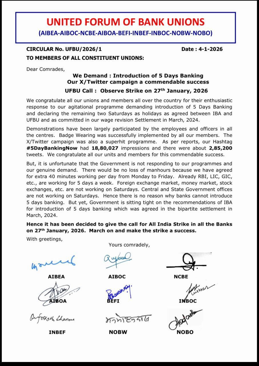 Dear Comrades, The United Forum of Bank Unions (UFBU) has officially decided and declared an All India Bank Strike on 27th January 2026, demanding the introduction of Five-Day Banking, as agreed in the Bipartite Settlement of March 2024. Our recent agitational programmes, including demonstrations, badge-wearing, and the X/Twitter campaign, have received an overwhelming response nationwide.…